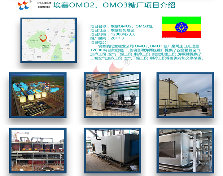 埃塞俄比亞糖業公司OMO2、OMO3糖廠是兩座日處理量12000噸甘蔗的糖廠,北京普瑞普勒為兩座糖廠提供了四套精糖空氣加熱工段、空氣干燥工段、制冷工段、廢蜜處理工段,為原糖提供了三套空氣加熱工段、空氣干燥工段、制冷工段等各類冷熱交換裝置。